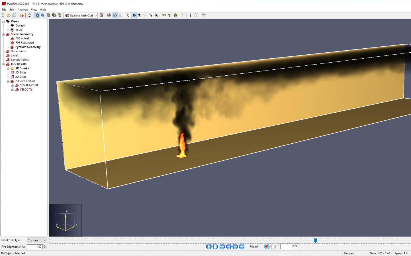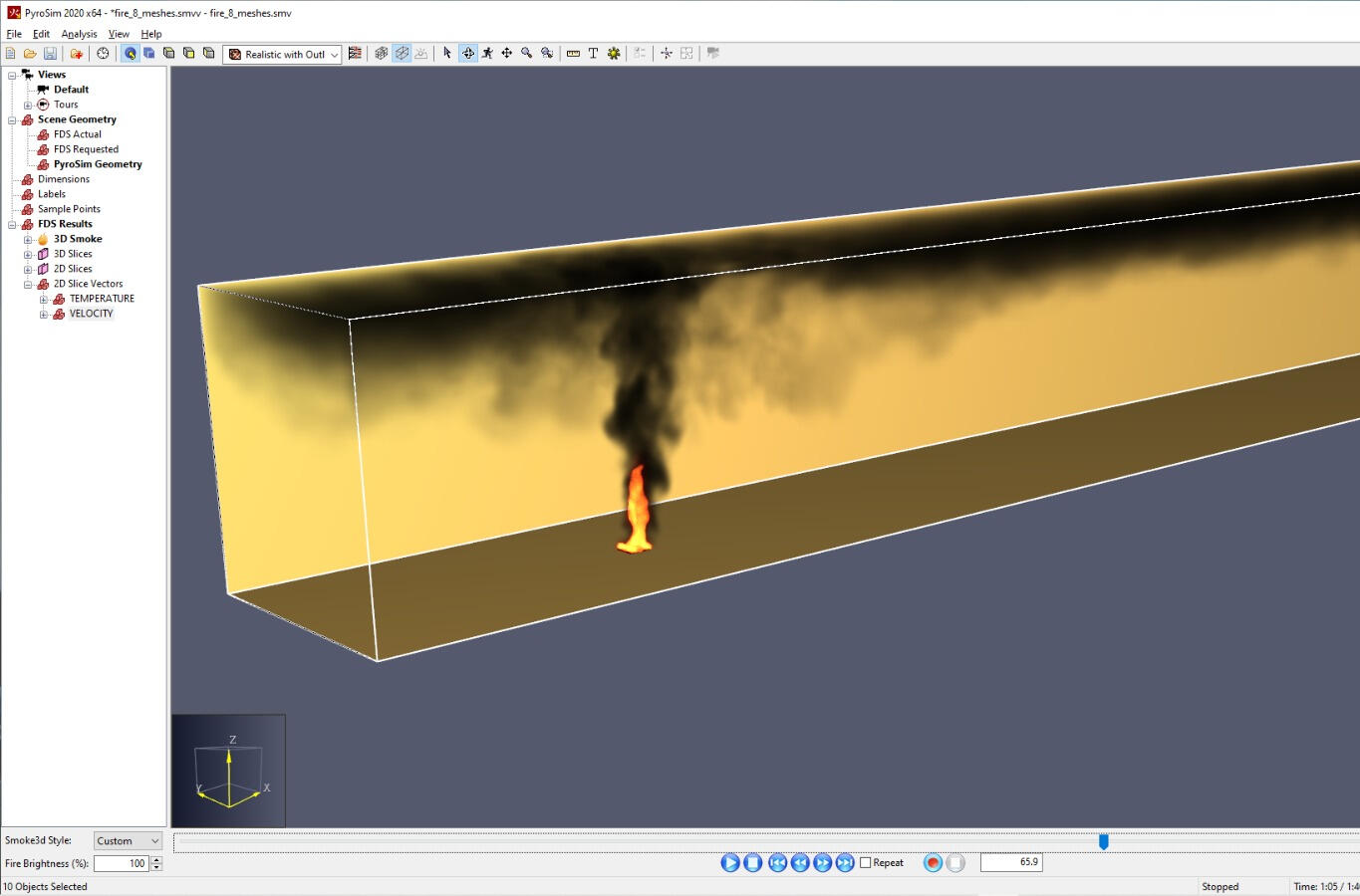 We use CFAST and PYROSIM to simulate fire growth, smoke movement, and heat